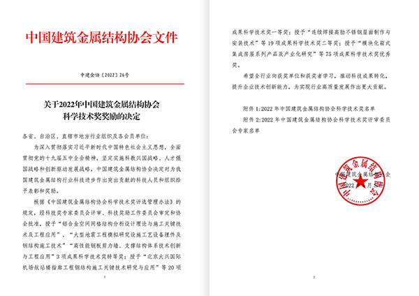 5月11日,中國建筑金屬結構協會發布公告,山東經典重工集團股份有限公司《裝配式鋼結構住宅關鍵技術研究及產業化應用》項目榮獲2022年中國建筑金屬結構協會科學技術獎一等獎。