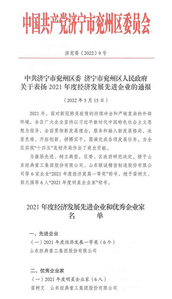 5月15日,兗州區委區政府發布《關于表揚2021年度經濟發展先進企業的通報》,授予山東經典重工集團股份有限公司“2021年度經濟發展一等獎”稱號,授予經典集團董事長苗樹文“2021年度明星企業家”稱號。