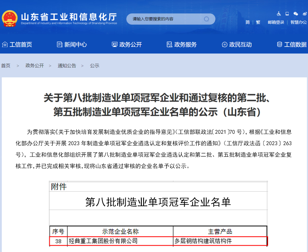 近日,工業和信息化部第八批制造業單項冠軍示范企業名單公示,經典重工集團股份有限公司位列其中,是該榮譽歷批次認定中唯一一家建筑鋼結構行業民營企業。