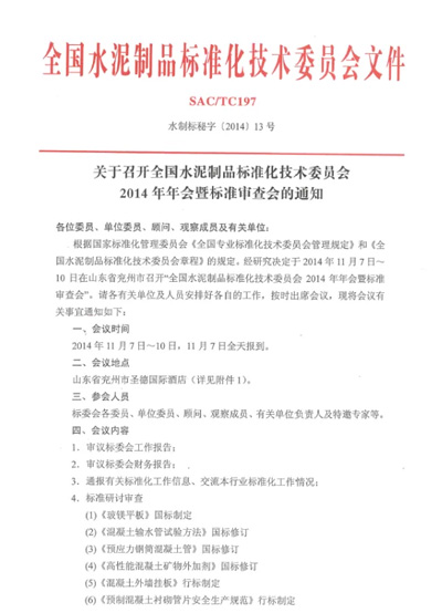 【會(huì)務(wù)公告】全國水泥制品標(biāo)準(zhǔn)化技術(shù)委員會(huì)2014年年會(huì)暨標(biāo)準(zhǔn)審查會(huì)