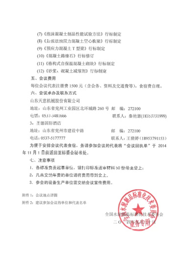 11月7日-9日全國水泥制品標(biāo)準(zhǔn)化技術(shù)委員會(huì)2014年年會(huì)暨標(biāo)準(zhǔn)審查會(huì)在山東天意機(jī)械股份有限公司隆重召開。屆時(shí),委員會(huì)相關(guān)領(lǐng)導(dǎo)及行業(yè)相關(guān)科研人員將蒞臨會(huì)議,共同商討制訂行業(yè)有關(guān)標(biāo)準(zhǔn)。誠邀各界人士屆時(shí)蒞臨天意機(jī)械、經(jīng)典集團(tuán)、卓越精工參觀指導(dǎo)。