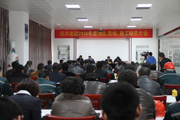 2月7日,為推進2014年度戰略目標順利實施,經典集團隆重召開項目、營銷施工動員大會。集團公司高層領導苗樹文、杜福生、鄭建康、司紅玲、鄭利昌、高建國出席了此次會議集團公司有關部門負責人、項目經理、營銷人員、施工隊長、生產車間負責人等80人參加了此次大會。